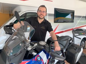 El portavoz de la venta, Juan Luis Cadena, con la moto BMW que se sortea.