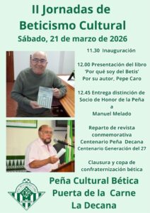 Además, se presentará y repartirá gratuitamente el número tres de la revista ‘La Decana’, que publicará un texto de la escritora Reyes Aguilar sobre la Generación del 27 y la necesidad de que el Real Betis se incorpore al Centenario de este colectivo literario que se celebrará el año que viene. La razón es la colaboración que tuvo con los escritores Ignacio Sánchez Mejías, que fue poeta, torero y presidente del Betis, además de inspirador del nacimiento de la Peña Bética Puerta de la Carne.