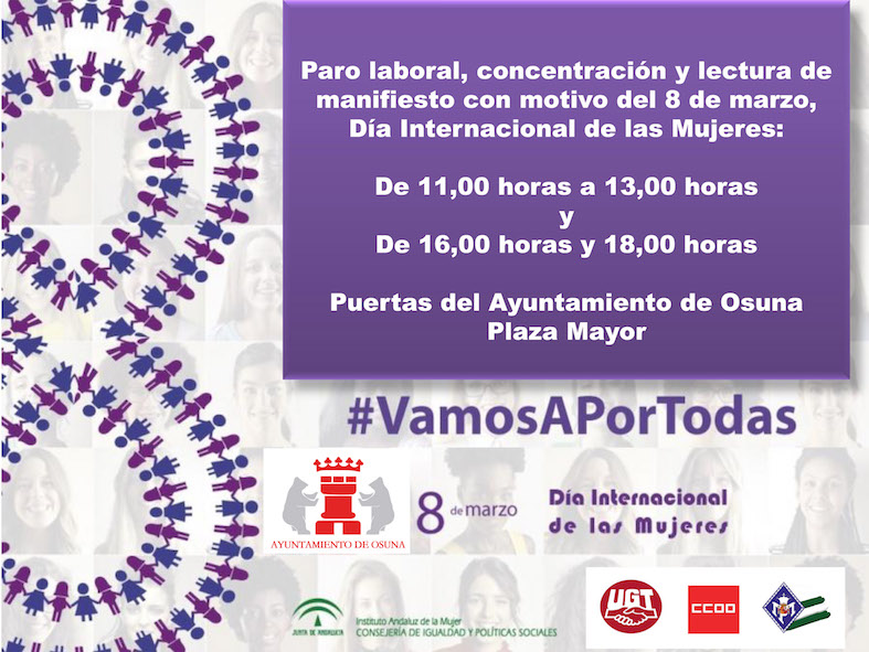 Como ha manifestado la alcaldesa de Osuna, “en ambos paros se llevará a cabo una concentración a las puertas del ayuntamiento dirigida especialmente a las mujeres de nuestra localidad, donde además se dará lectura a un manifiesto con el que queremos reivindicar una sociedad en la que las mujeres vivan libres de violencia machista, una sociedad igualitaria y participativa, en la que ocupen el lugar que les corresponde por derecho y por capacidad, al mismo tiempo que reiteramos nuestro compromiso activo con la eliminación de la discriminación laboral, económica y social de las mujeres.”