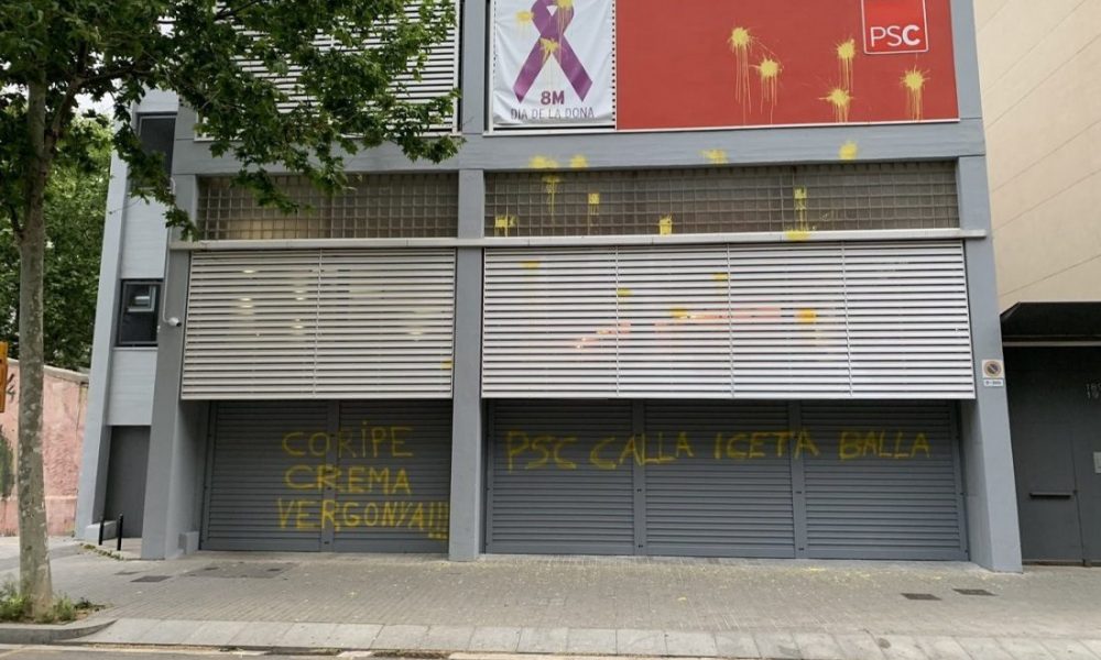 Pintadas en la sede del PSC contra Coripe por la quema del Judas. La sede del PSC ha amanecido este lunes con pintadas amarillas en las...