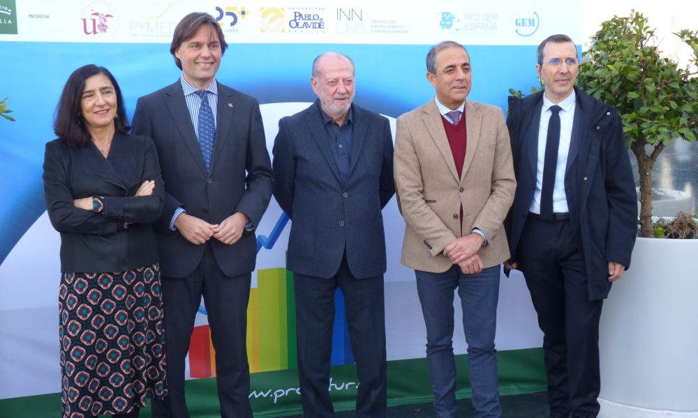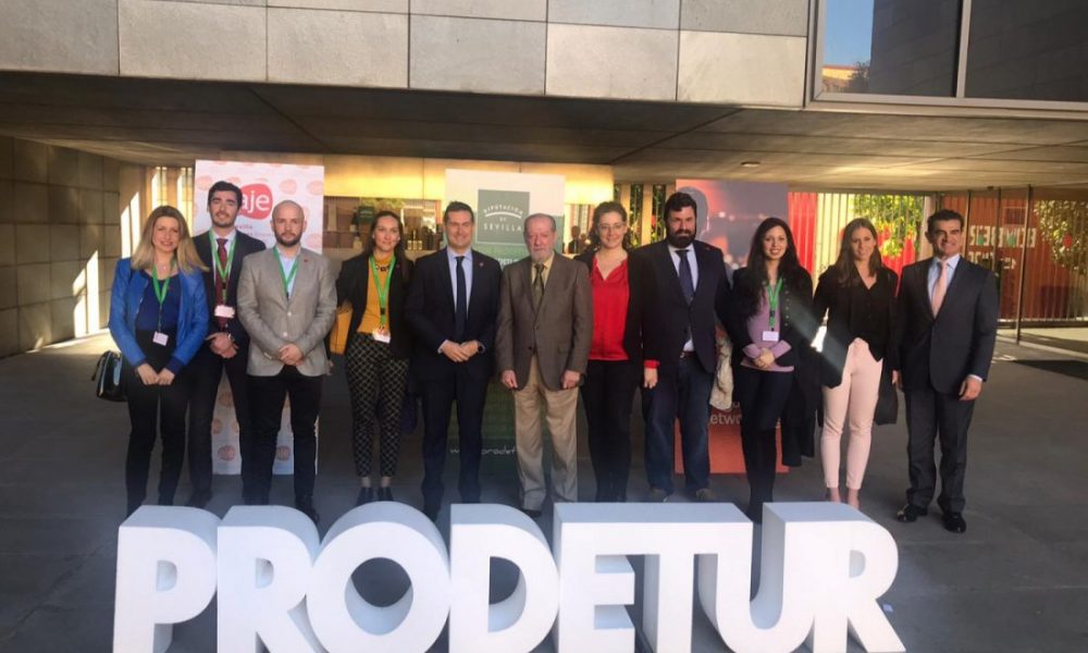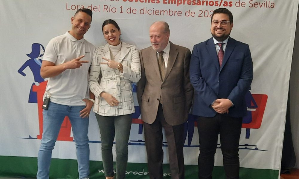 El presidente de la Diputación, Fernando Rodríguez Villalobos, junto a la presidenta de AJE-Sevilla, Candela Luque, y el alcalde de Lora del Río, Francisco Javier Carrasco, han dado...