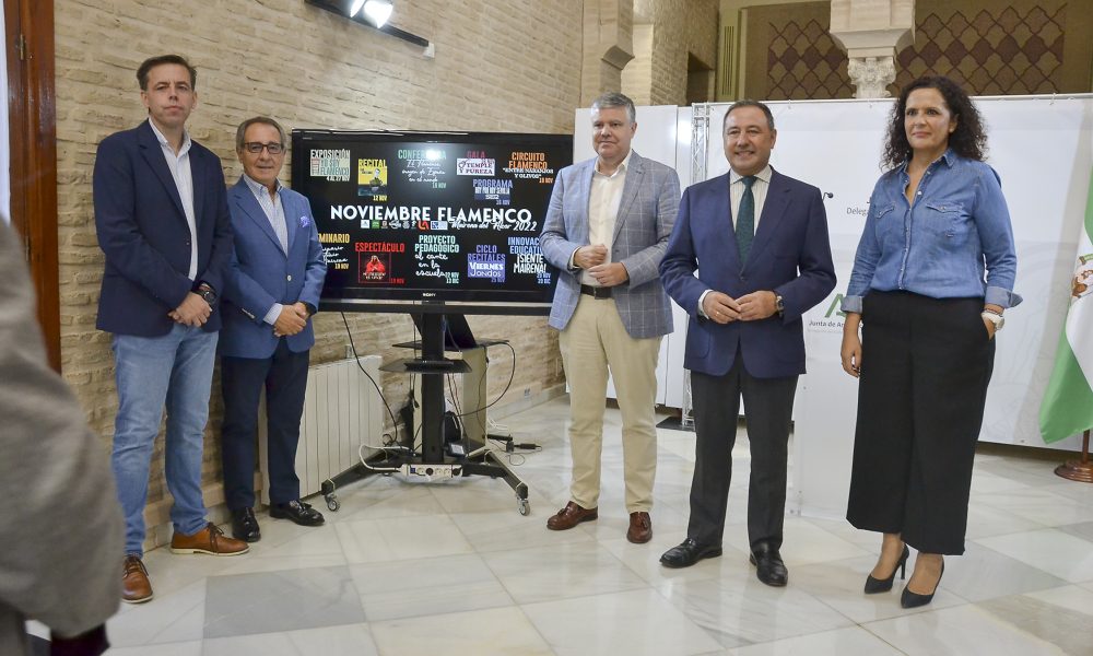 El delegado del Gobierno de la Junta de Andalucía, Ricardo Sánchez, y el alcalde de Mairena del Alcor, Juanma López, han presentado hoy Noviembre Flamenco, una...