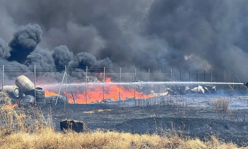 Un incendio que se ha iniciado por el fuego repentino en el motor de un coche afecta a una fábrica de envasado de aceitunas en la...
