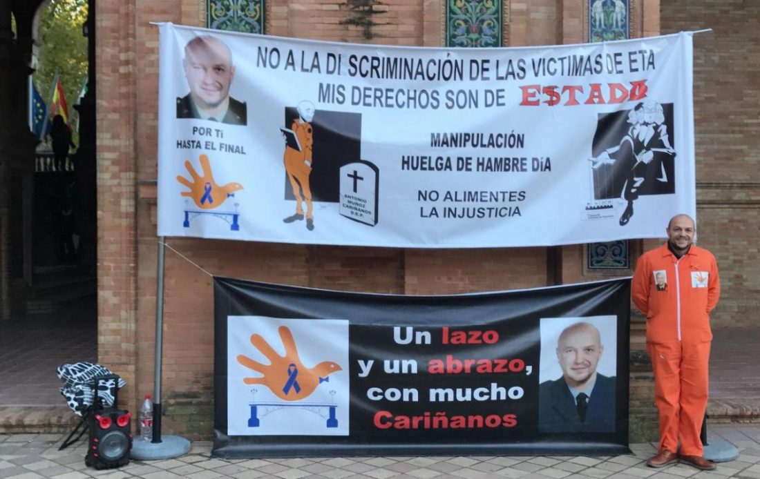 Francisco Javier Muñoz Estévez, hijo del Coronel Médico Militar Antonio Muñoz Caríñanos, asesinado por ETA el 16 de Octubre de 2000 en Sevilla, ha iniciado una acampada y huelga de hambre a las puertas de la Delegación del Gobierno de Andalucía para reclamar ser reconocido oficialmente como víctima del terrorismo y cobrar la correspondiente indemnización.